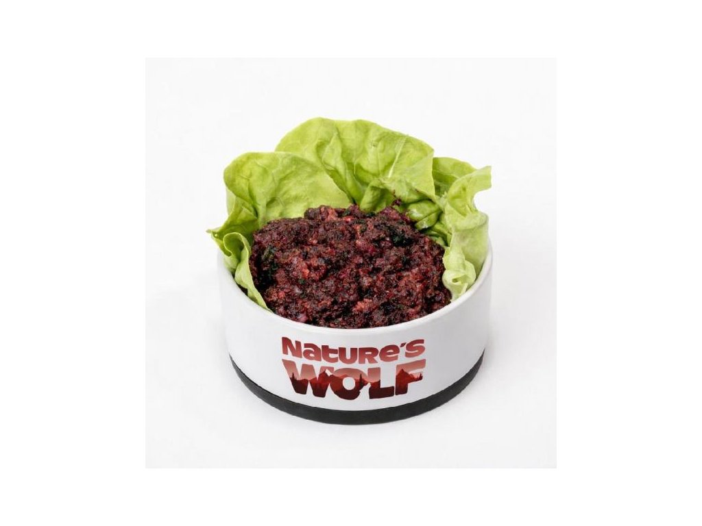 složení: Jelení 48% (jelení maso, mleté jelení kosti a chrupavky), jehněčí 27% (jehněčí droby a srdce, jehněčí zelené dršťky), zelenina 17%(mrkev, celer, salát, dýně, červená řepa) ovoce 8%(jablka, švestka, hruška, aronie, borůvky)