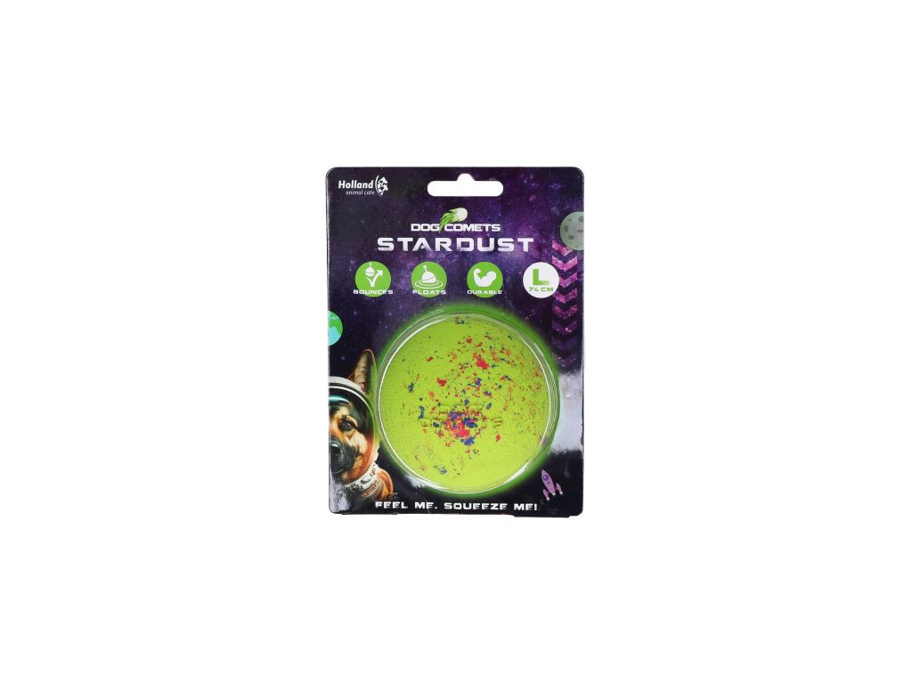 Stardust míček je vyroben z přírodního kaučuku, který dokonale skáče a je velmi odolný. Pejsci jsou nadšeni, jak pohodlně se žvýká a majitelé zase tím, že vydrží, při žvýkání masíruje dásně a udržuje psí zoubky čisté. Míček lze po hraní snadno opláchnout, protože je voděodolný.