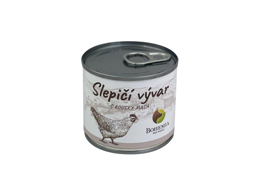 Složení: Vývar ze slepičích skeletů 79,9%, slepičí maso 20%, kvasnice 0,1%.